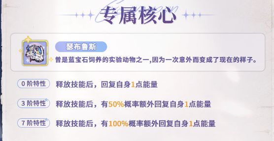 专属核心的效果非常简单,就是单纯的回能机制,很多小伙伴都觉得没用,不如哀怜无瑕的高额增伤,不如慕斯白昼真夜的群体增益。