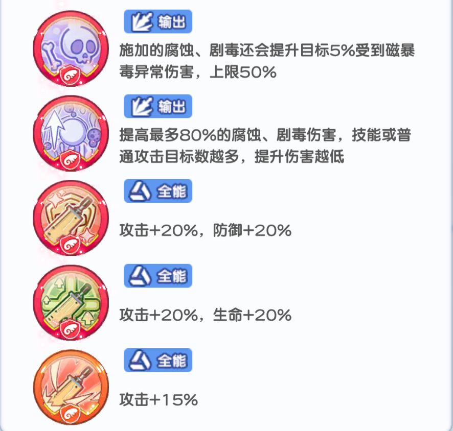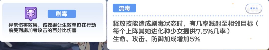 每上阵1个其她进化种少女,蓝宝石释放技能造成剧毒状态时有7.5%几率将剧毒溅射至相邻目标