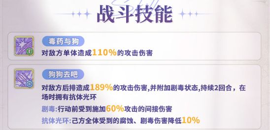 技 能——狗狗去吧:对敌方后排造成189%的攻击伤害,并附加【剧毒】状态,持续2回合,在场时拥有【抗体光环】