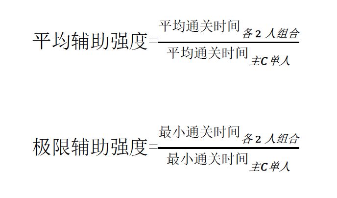 统计过程中,采用主C【凯茜娅-蓝闪】单人的的通关时间作为统一参考,因为BOSS总血量恒定不变,各组合的输出强度(DPS)与通关时间成反比例关系,故定义各组合的辅助强度为单人的的通关时间与各组合的的通关时间的比值。
