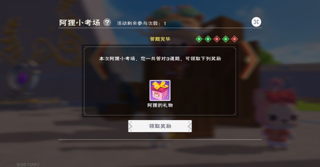 各位小伙伴只需要答对3道题就可以点击领取奖励获得【阿狸的礼物】一份哦~