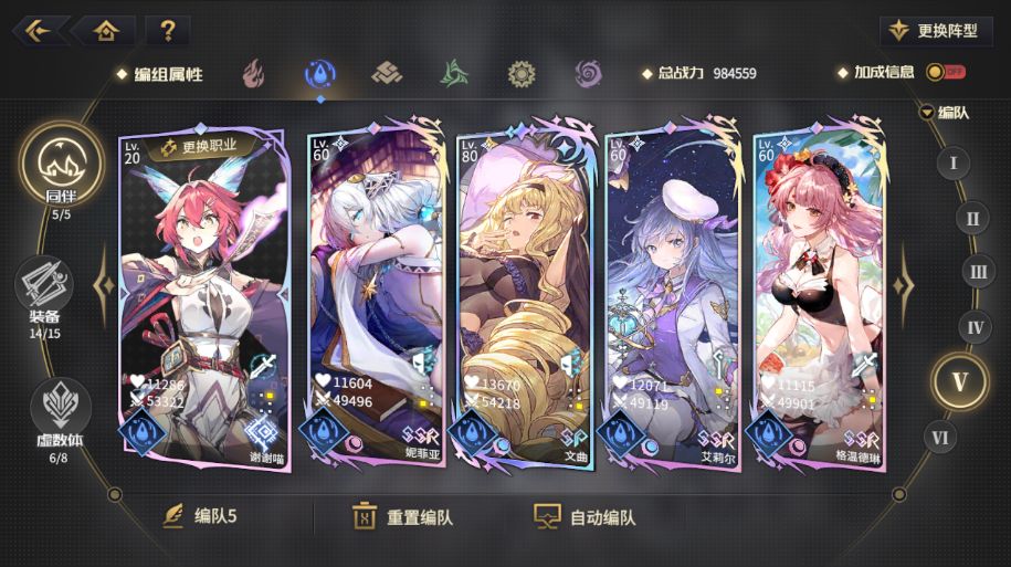 角色方面,艾莉尔是水属性必需的角色,需要使用450个朔同调签将同调等级提升至5,同调签的获得方式为使用万灵许愿签兑换或卡池中重复抽取艾莉尔,如果没有则不建议将水属性作为主力培养属性,实力会大打折扣。文曲作为减少全队冷却时间的辅助,可以免费制作。格温德琳、艾薇拉和妮菲娅则各有千秋,格温德琳的伤害最高但依赖群攻环境,如果敌方的输出技能都是单体的话格温德琳就很难发挥;艾薇拉可以大幅提高水属性角色的生存能力,但自身需要暖机,更适合长线作战;妮菲娅的爆发能力很强,但全队减少调律恢复速度的负面效果让她在长线作战中会拖队伍的后腿,只适合短线作战。