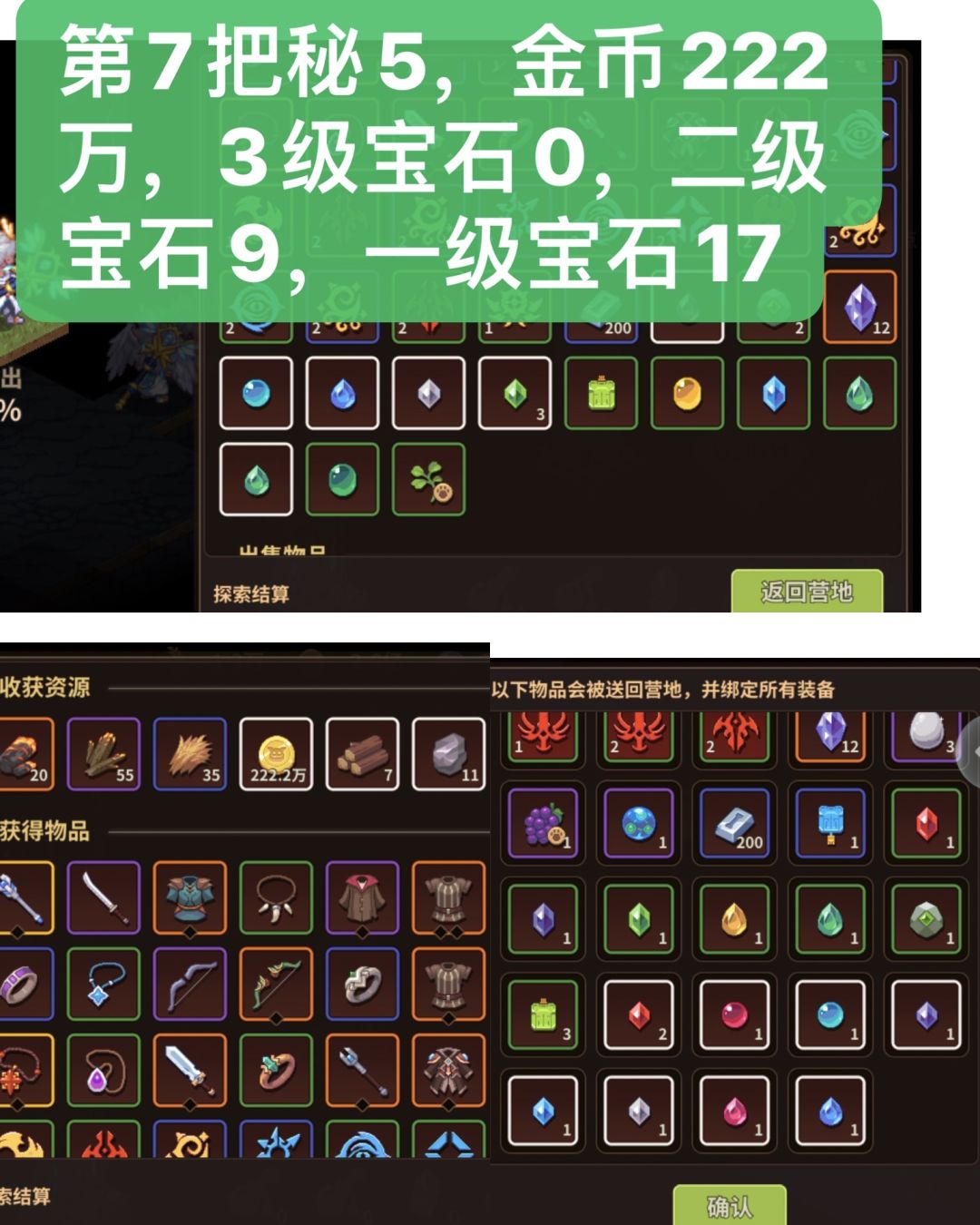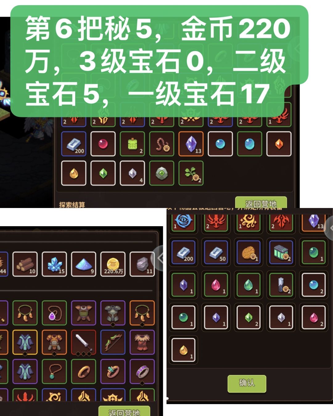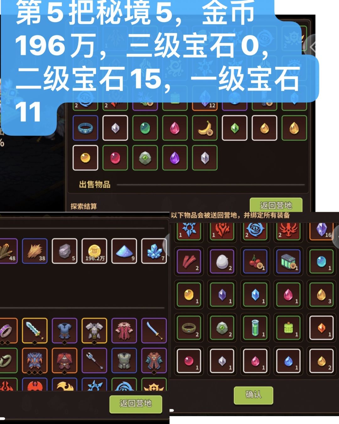 下图由3部分组成,中间大图,左下角小图,右下角小图,中间大图为20层结算界面宝石数据,也就是11层到20层的收益,左下角是这一把秘5金币收益,右下角图为1到10层宝石收益,图中撰写的数字为加起来一把秘5的宝石总收益。