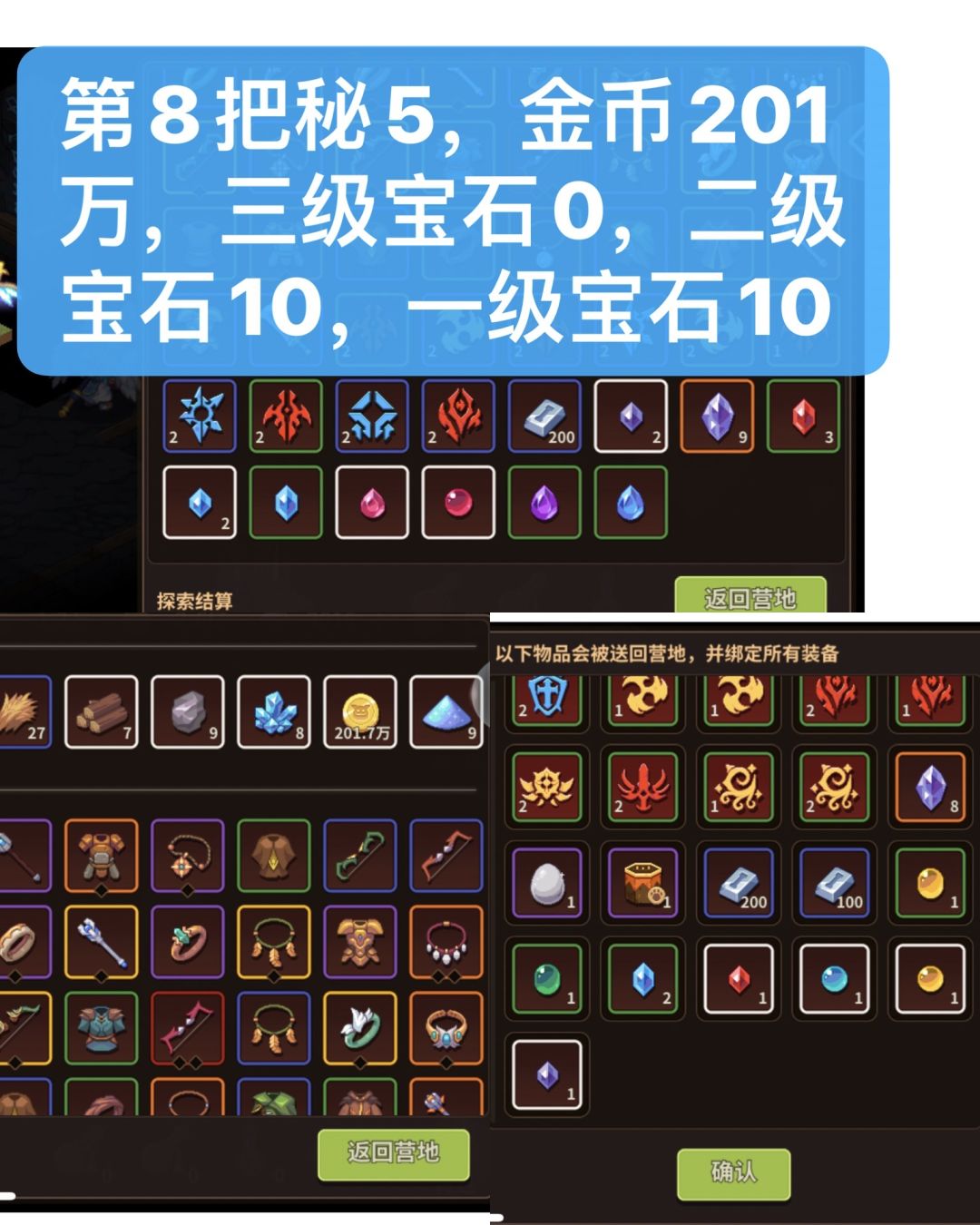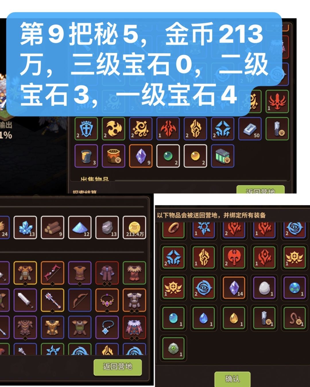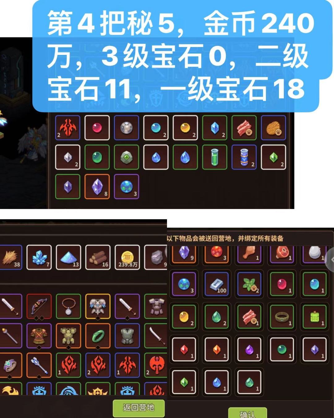 下图由3部分组成,中间大图,左下角小图,右下角小图,中间大图为20层结算界面宝石数据,也就是11层到20层的收益,左下角是这一把秘5金币收益,右下角图为1到10层宝石收益,图中撰写的数字为加起来一把秘5的宝石总收益。