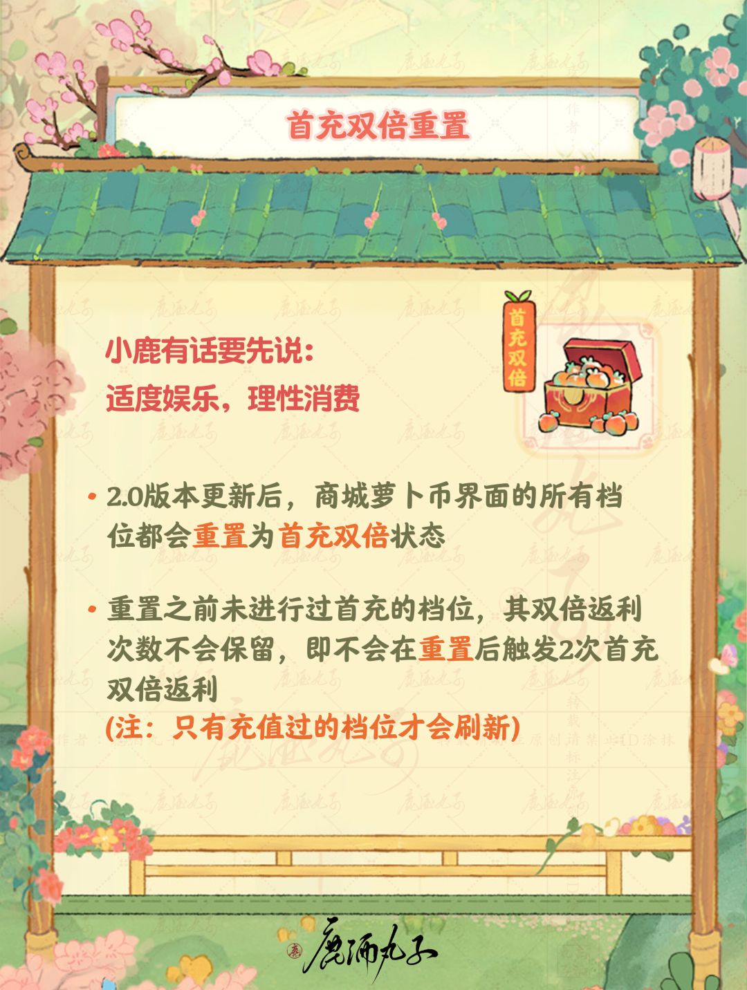 🌸重置之前未进行过首充的档位,其双倍返利次数不会保留,即不会在重置后触发2次首充双倍返利