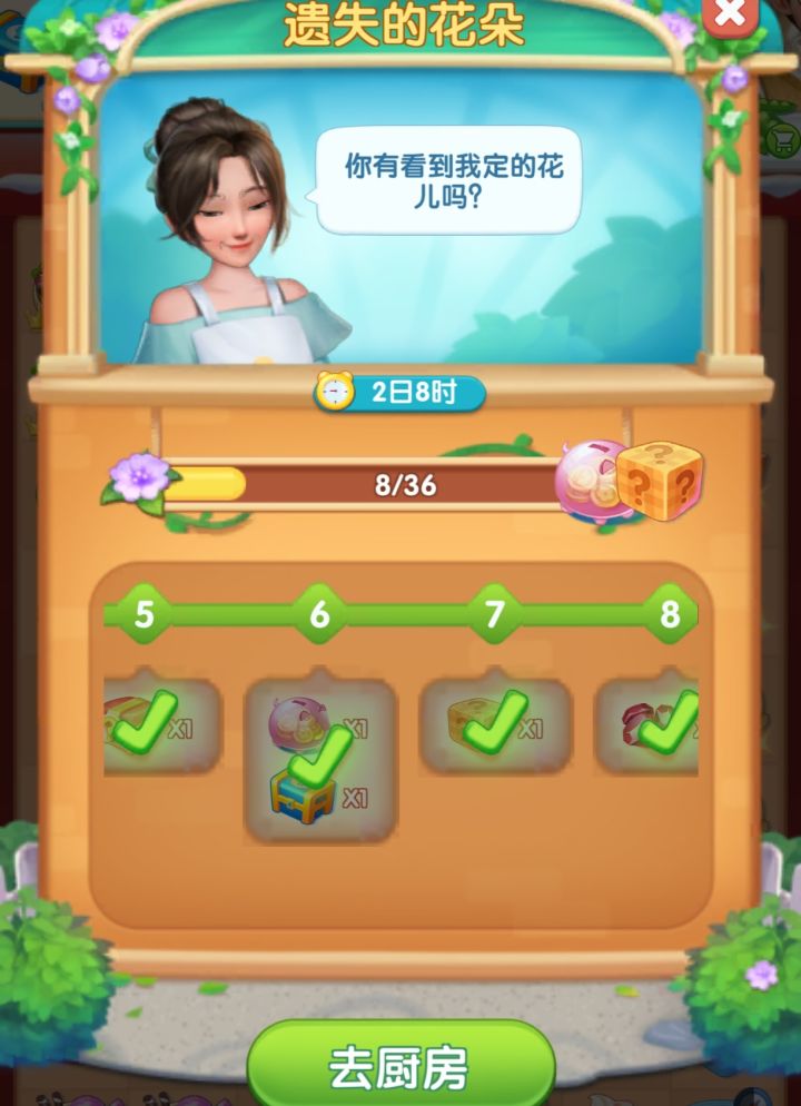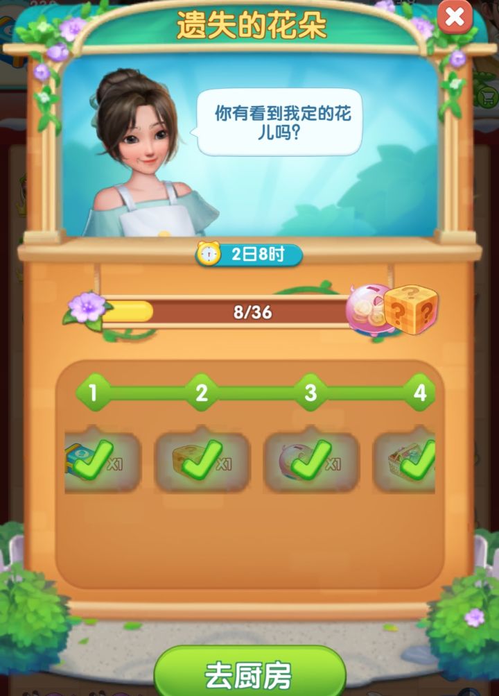 紫色花朵需提交订单才能获得,建议先多提交点订单,把花朵合成最高级,再去收集(紫花合成1级可以收集1朵紫花,2级可以收集3朵紫花,3级可以收集7朵紫花,4级可以收集15朵紫花,5级可以收集31朵紫花),上图②③④分别对应每关可以获得的奖励,一共11关,终极大奖有半个万能石碎片。