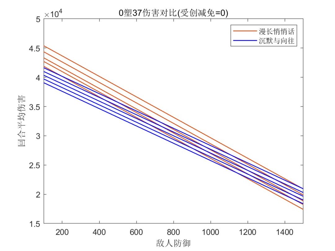 注释:这次一共选择了两个自变量,一个是防御,一个是创伤减免(再造)。在现今boss的防御下,仍然是悄悄话更好。而再造是boss第四阶段每掉一管血就会加两层再造。可以看到零塑37在14层再造时,也就是大约在85万时,沉默与向往会超过悄悄话。而二塑37大约在11层再造时(70万),沉默与向往超过悄悄话。四塑五塑大概在第八层再造(55万)时,沉默超过悄悄话。可以说,要凹高分,满增幅的沉默与向往是大佬们的必备。而萌新们就直接选悄悄话就好了。