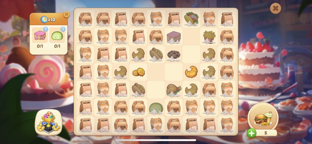 - 点击右下角的美食道具,获得可可爱爱牛角包(或小饼干),将牛角包移动到被封印的牛角包上即可合成粉色夹心蛋糕,点击左侧任务面板即可提交完成任务。