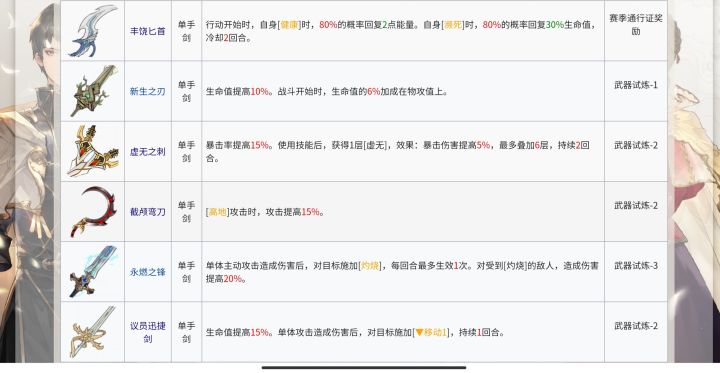 t2金武禁卫长枪,朴实无华的加生命。末日镰刀,背击泛用性低和劫颅弯刀同理,值得一提的是背击增伤有30加镰刀25有55,但是能带镰刀的人通常没有足够移动力绕背,如果能和劫颅换一下特效劫颅能提一个t位。