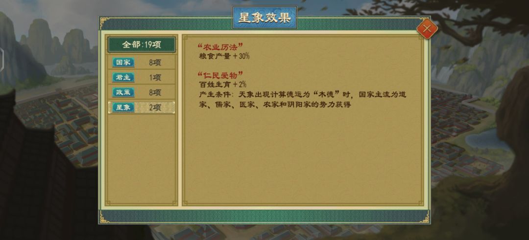 农业历法:当历法准确度>50%时,粮食产量获得额外提升,最高为30%;当历法准确度<50%时,获得粮食减产的debuff,最低为-50%。