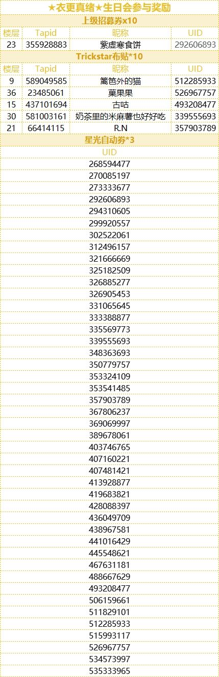 制作人们久等啦,让我们恭喜以下幸运的制作人们!助理君已统计全部正常显示楼层与图片,奖励会在7个工作日内发放到制作人的礼物盒中,请注意查收~!衣更真绪的生日快到啦!让我们一起带着关于真绪的可爱表情包们,大声说出happy birthday~(◍˃̶ᗜ˂̶◍)✩即日起~3月16日23:59,快来分享关于真绪的各种可爱表情包吧~!不要忘记附上正确的UID哦!毛豆豆会摸1位制作人送出上级招募劵*