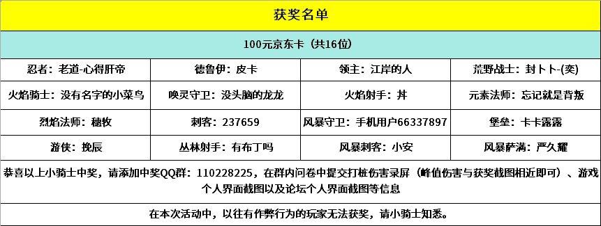 1、村长将在每个参与活动的混合职业(总计16个混合职业)中,分别选出该职业中峰值伤害最高的小骑士,对这16位小骑士送出100元京东卡*1,若某混合职业无人参加则轮空。