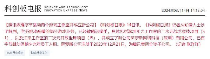 据《科创板日报》报道,字节跳动去年年底裁剪的部分游戏业务,现已被腾讯接手。具体包括深圳引力工作室的二次元战术竞技项目(S1),以及江南工作室的二次元开放世界项目(J5)。