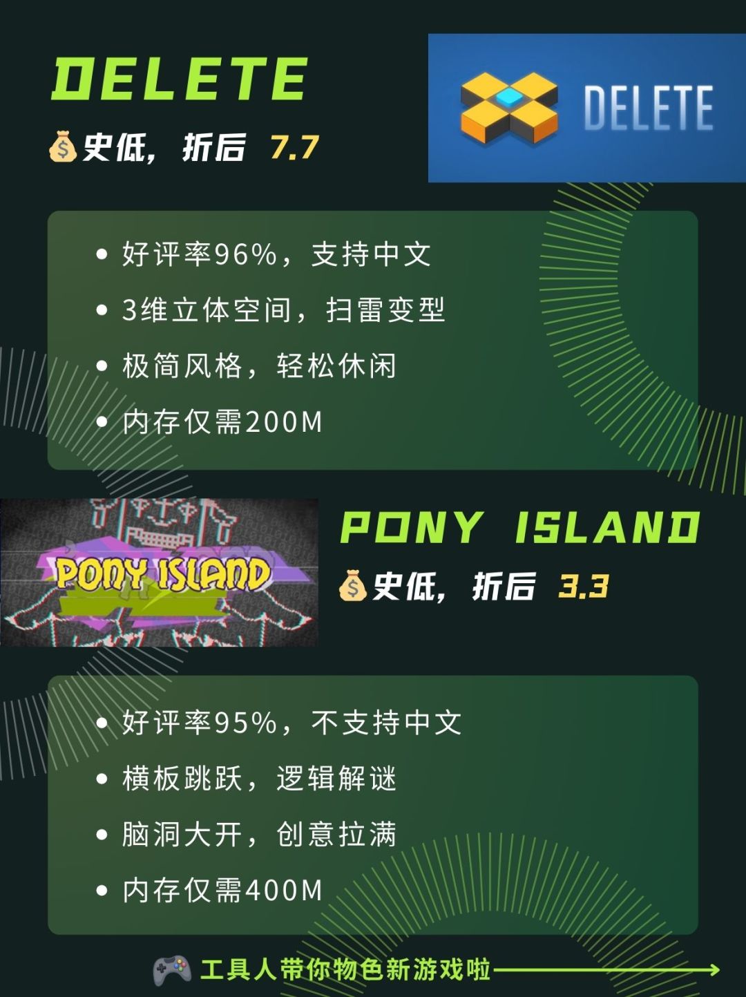 简评:小马岛,横板跳跃、逻辑解谜,评价超高,作者创意拉满。需要400M内存。