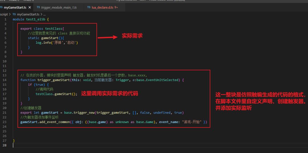 3.1.需要声明在【当前项目的 module】下,详见【项目根路径\script\trigger_module_main_1.ts】这个文件的module。不在这个 module 下写的函数没法被调用。