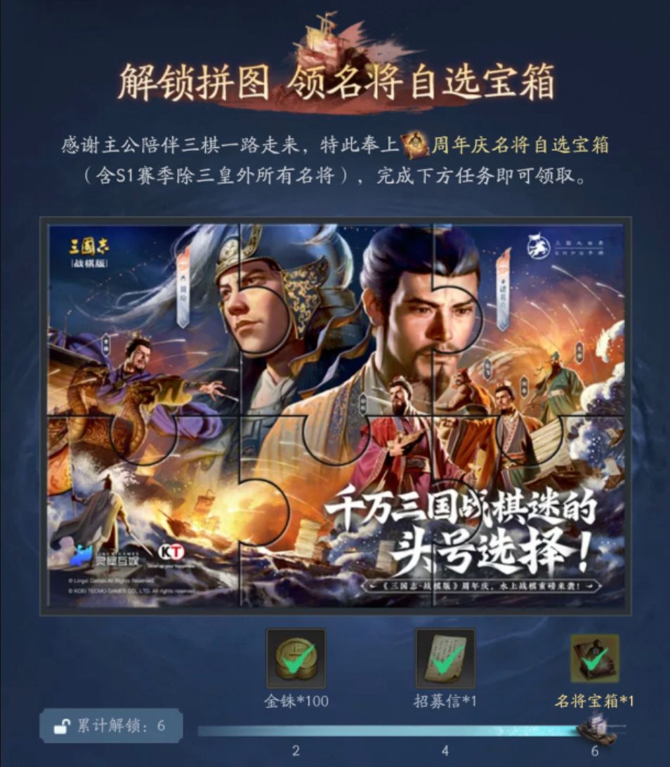 活动规则:进入活动页面,完成登录、观看周年视频、邀请好友桃园结义等拼图任务,即可合成拼图,领取一赛季除刘备、孙权、曹操外非内政名将自选、金铢等好礼。