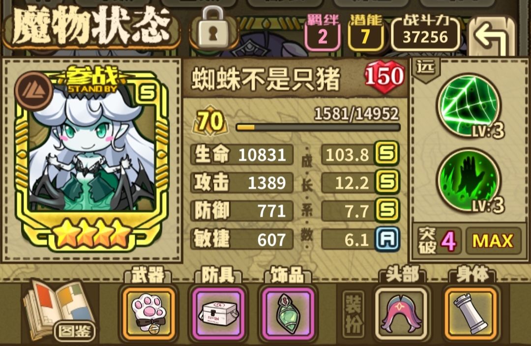 53点攻速加成,是我能拿出的最豪华的攻速套装了,几乎也是现版本最极限的攻速套装。公主史莱姆的分身可以100%继承攻击力,攻速,暴击等词条,每分裂一次就等于输出能力翻一番。但考虑到分身的生存能力堪忧,因此她只适合于某些需要大量输出但敌方伤害较低的关卡,例如地区威胁。对于竞技场和推图,还是三思而后行。
