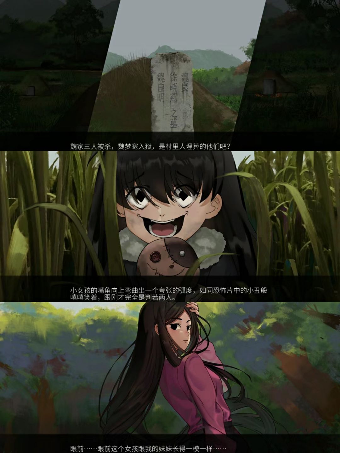 )神秘失踪的妹妹,与世隔绝的山村,怪异诡谲的祭祀剧情都戳到了我想要一探究竟的好奇心理。虽然可以在本作上看到很多作品的影子,有点缝合意味,但是缝合自然不突兀且剧情足够反转,是一款合格优良的悬疑作品惊悚作品,剧情部分抽丝剥茧,没有很强推理(大家不要过多在意本作逻辑推理部分