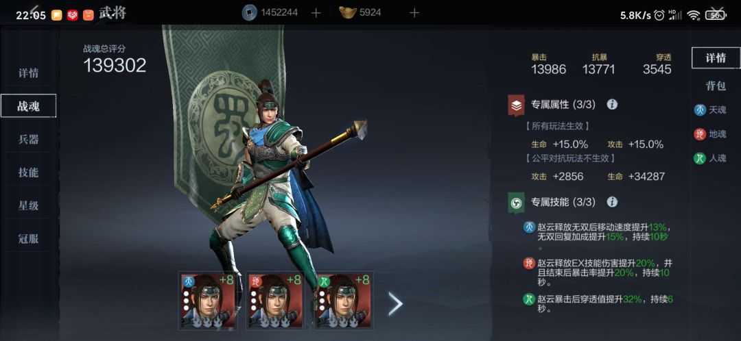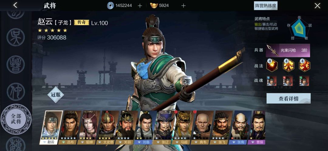 在选好自己主玩的武将后,下一步就要关注该武将的战魂、兵器、接你那个、星级以及冠服。
