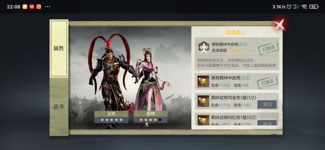 这个比较简单了,当获得新英雄时,与已有的英雄是有羁绊关系时候,系统会提示进行激活,激活会提供额外的属性加成和武将特殊技能。比如刘关张特殊合体技能、貂蝉和吕布等等