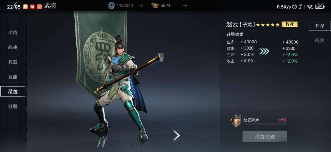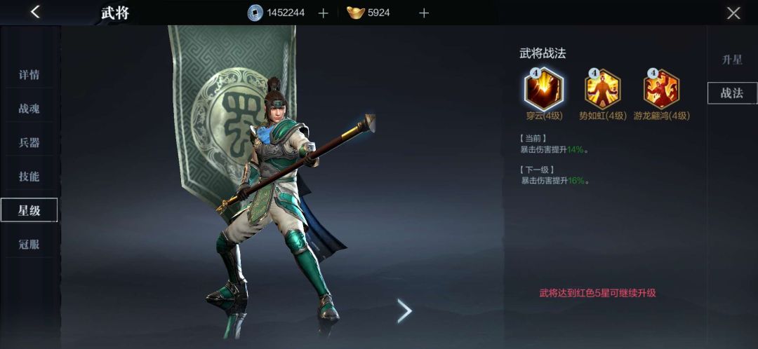 (2) 星级:品质越高的武将需要的碎片数量越多,主要为超凡和卓越的碎片,升星可提供更多武将属性加成和战法的提升,战法就类似于武将的被动技能,所以选择好适合的英雄留着碎片进行培养比较重要。战法升级的材料来源于公会商店购买、玄镜论武和百花。