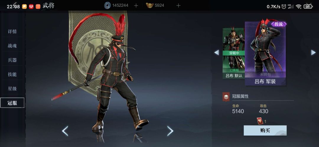 (3) 武将冠服:就是时装系统,提供额外的武将属性加成和独特的外观显示,目前有些武将有,个别武将没有,获得来源也是商店购买和限时活动。