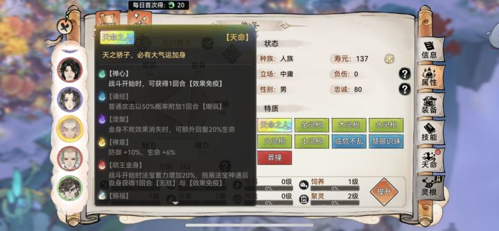 第六 单独讲一下六维重要性,后期潜力很重要,这个直接影响战力,资质/根骨这个影响人物境界炼体等级提升,也不能太差,根骨大于90可以去后山泡体质,机缘大于80可以去洗天赋和癖好。智慧影响生产技能提升。对于弟子会有很多随机词条,体质》天赋〉癖好,体质只会有一个,其他两个可以能各有三次。