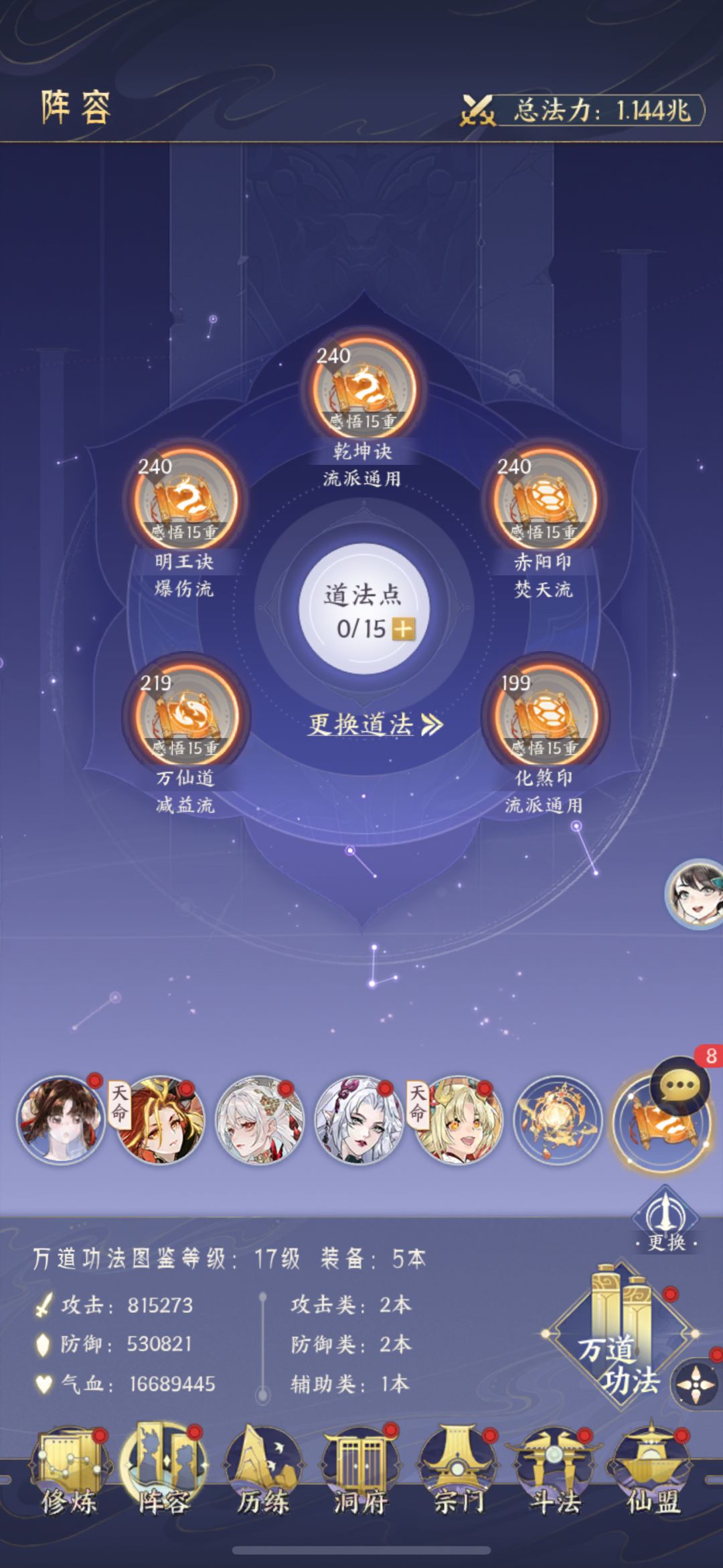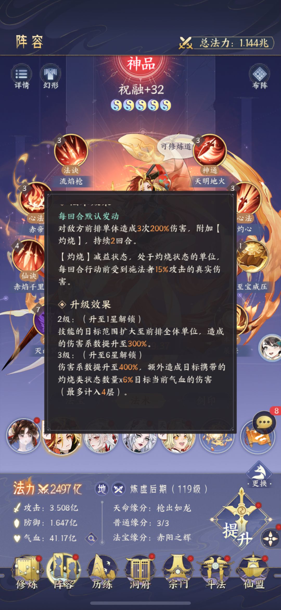 主角的法诀和阵法一定要带能挂火的,道法赤阳印或者同生印负责回血都可以,万仙道15重结算伤害上限+4层对于祝融来说非常bug,会导致祝融结算伤害由4层上限到8层相当于最高目前生命值百分之48的伤害,当然只是理论,还是那句话现在很难挂上火,高星祝融配合高星辰龙第一回合只要不被招架或者闪避基本上能把你前排杀完,但是没有高星辰龙就不要硬拉,还是优先推荐辰龙。