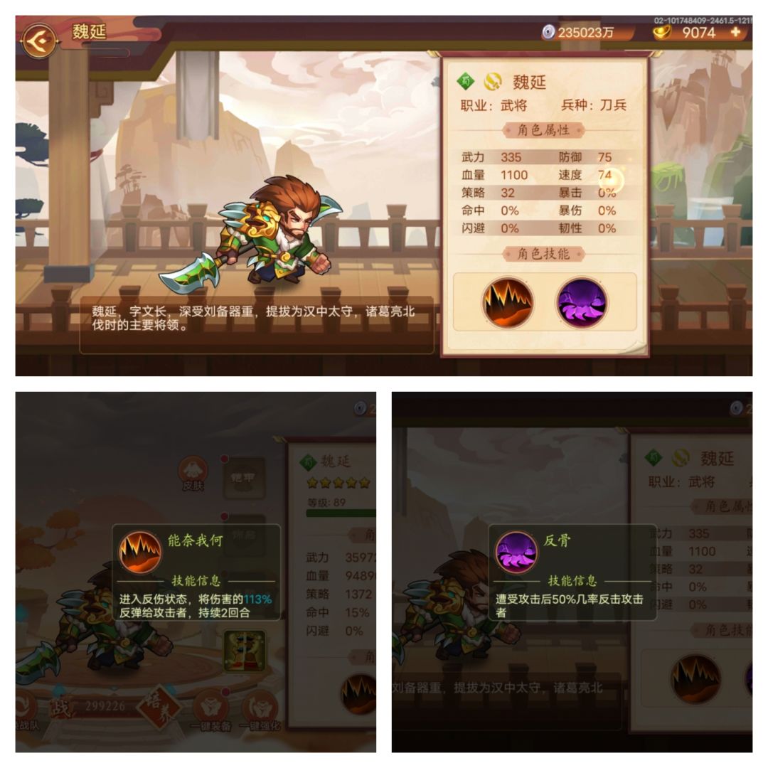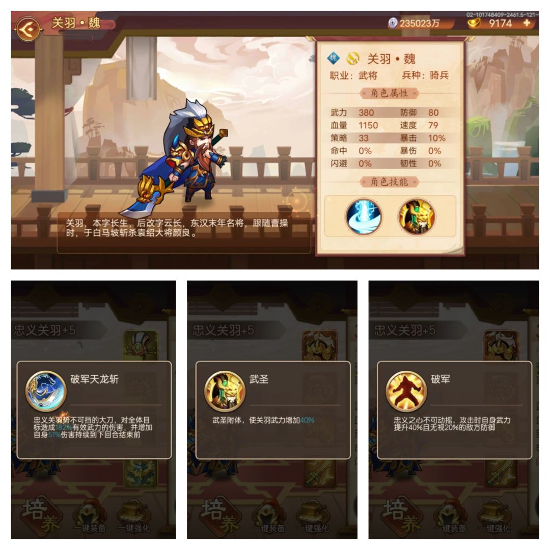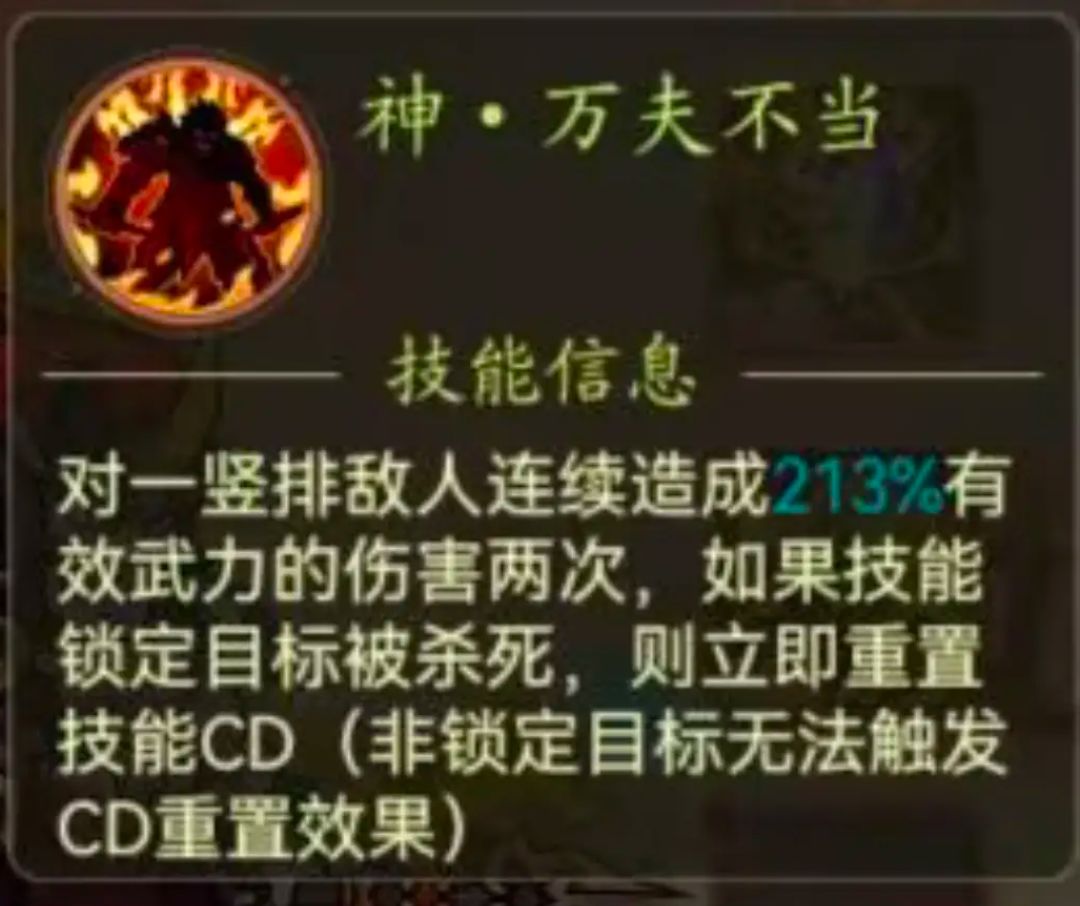 平民最强的单体输出,主动系数有432,自身武力提升也非常高,在单体副本,伤害比较明显,没有无视防御,遇到防御高的怪,基本就是刮痧了,不过重伤还是有点点用处。能够任意攻击前排或后排的武将,单体定比较局限,当然氪金的单体武将除外。 魏关羽: