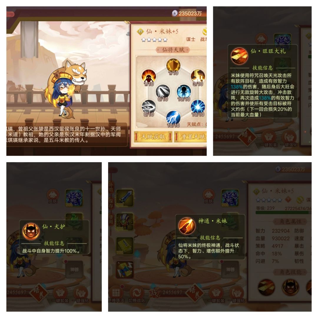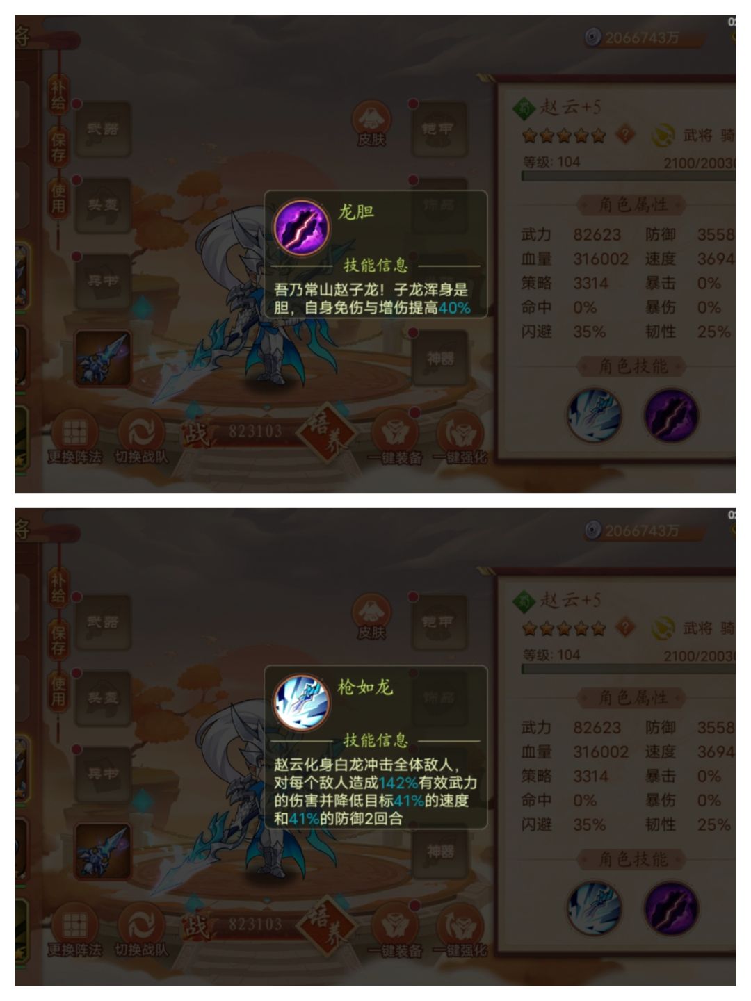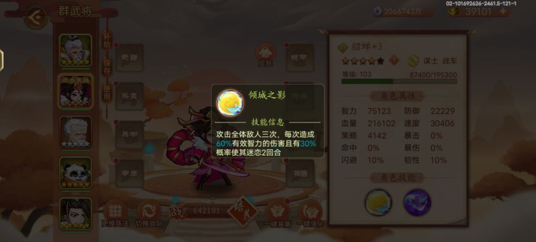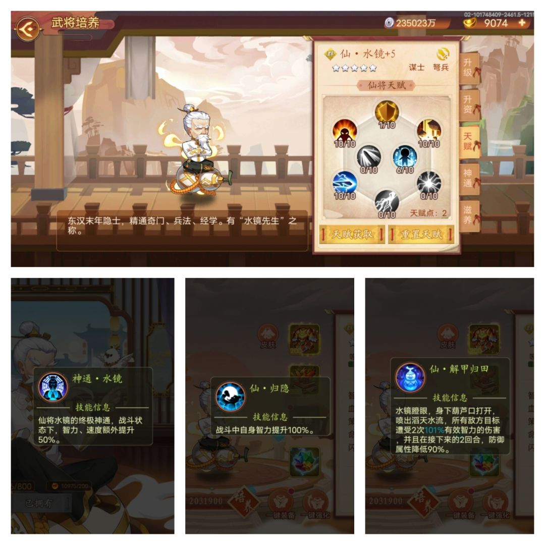主动可以降低敌方41%防御和速度,闪避是平民最高的,专属+逐日鞋,最高可达60%,八卦阵必上的辅助,新手可以用用,如果不往仙赵云方向去,最好不要花太多资源培养。