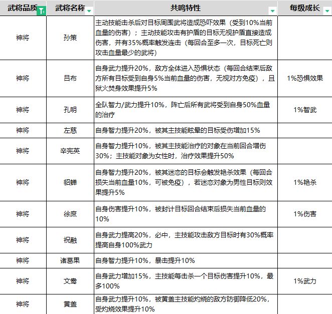 出了共鸣后成为平民必上的武将,其最强的是能够无视免疫灼烧对方全体,灼烧系数最高达到14%,20回合下来就能烧掉93%的血,武力也增强20%,而且被动有60无视,就算在后期副本吕布也是伤害很高的,后期副本没有吕布根本没法打,一般是当个副输出,伤害不够是必上的。