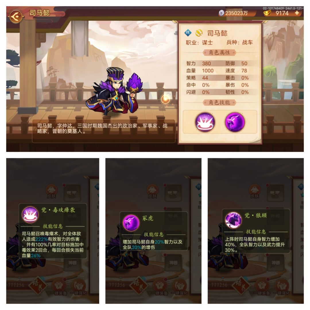 毒伤百分比最高的武将,一回合能毒掉敌方全体当前30%的血,但缺点很明显没有辅助效果,所以不建议培养,毒将的话只培养司马懿就够了。