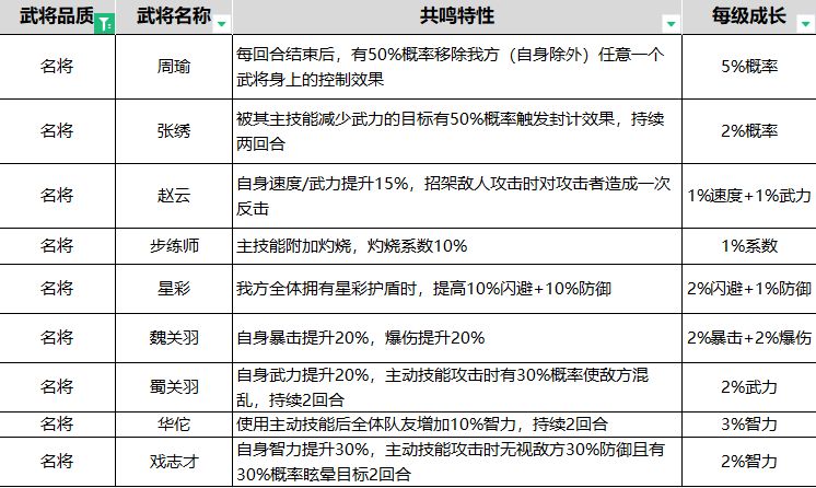增益很高,但其强在主动技能,使全体免疫任何负面效果,再也不用受制于敌人了,还能无视免疫烧掉对方的血,不过要敌人打你才能扣血,打你一个扣2%的血,五个10%的血,孙权的专属没用,不如用赵云和貂蝉的专属,孙权的共鸣是垃圾不建议开,可以先不急着培养,到中后期培养都可以,在打两仪宫50层仙貂蝉是必上的。对了顺便说一下,现在的副本武将是每两回合必开大的,所以说孙权能够反掉对面更多血。