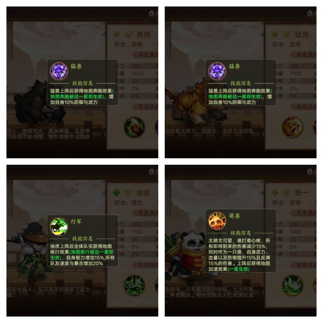 对平民最大的用处就是跑图加速,他们的速度大小分别为:黑熊=老虎<奇一<徐庶,他们的速度是不叠加的,同时上场按最快的那个生效,只要上场就行了无论在哪个队伍。