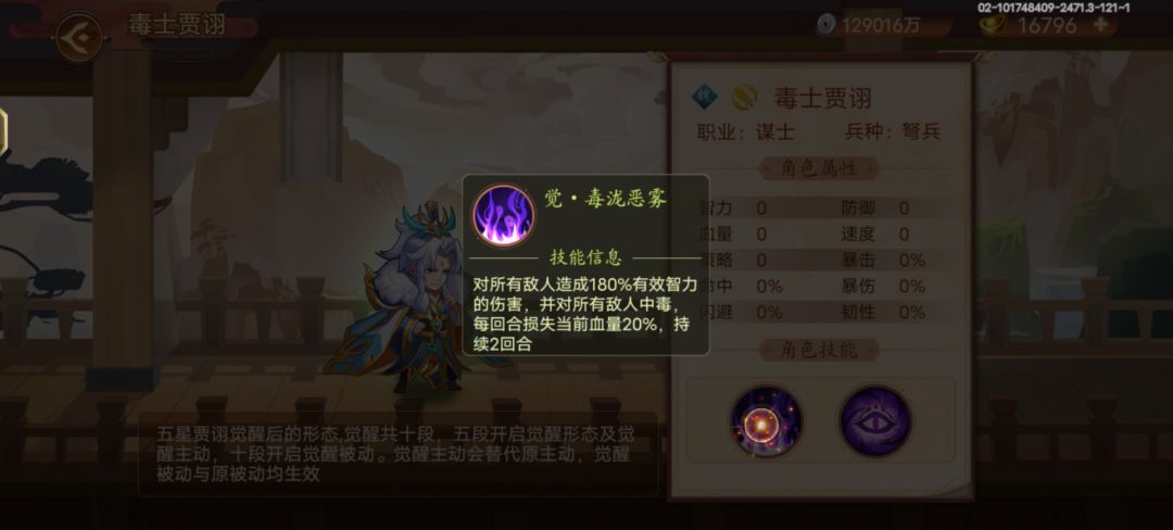 主动可无视免疫降低敌方62%的输出,相当于增加62的免伤,挺有用的,因为敌方免疫怪往往是伤害最高的,被动有80增伤,非常高,但只针对单体,平民打副本最高可以到四星,但能打过那副本的人,也不会缺这个辅助,不过升到五觉就可以成为平民一流武将,但真正质变的还是仙,其普攻能够破除对方的免疫,使对方免疫将能够像普通武将一样挂上减益,负面状态,不过不是平民能搞的。