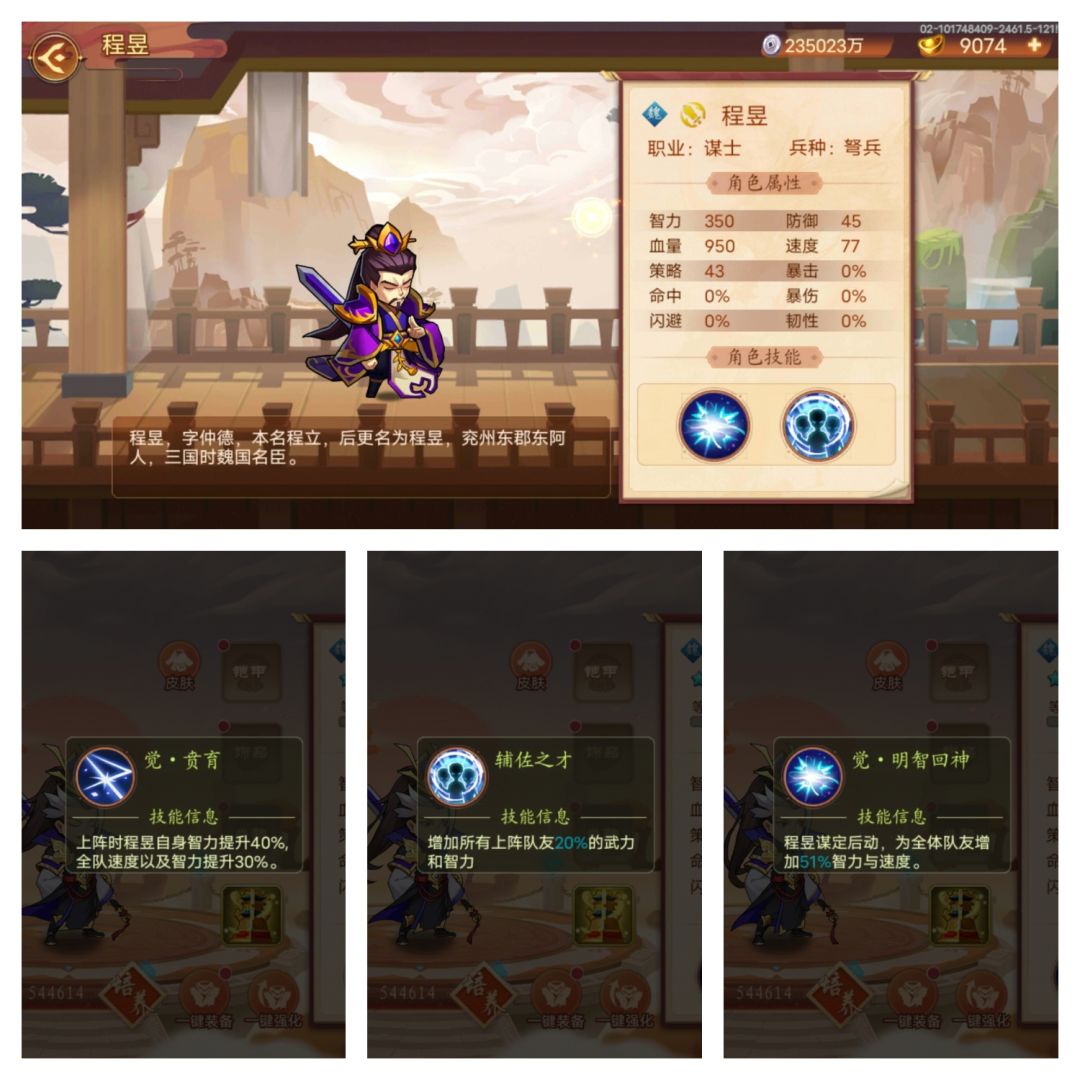平民最肉的武将,自身有50免伤,提升全队61%武力,还挺高的,但缺点是,速度太慢了,基本都是尾速,作为辅助最重要的是速度,他速度太慢了,队友吃不到增益,不过可以在PⅤP上用,非常好用,非常肉。 程昱: