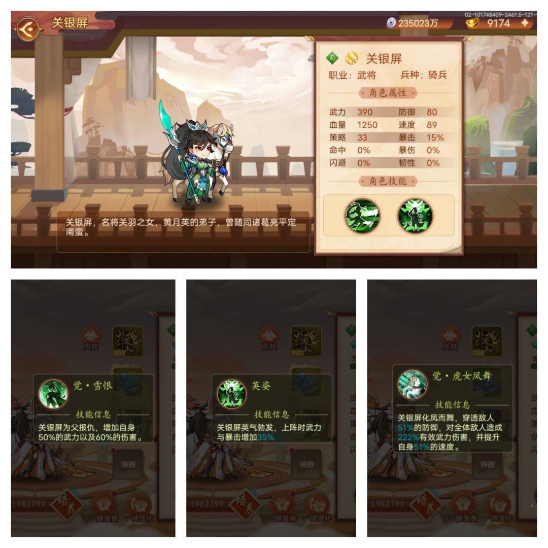 群体武力输出,,伤害还是可以,也真20%无祝,前面没输出的时候可以养,他一直陪你打到童渊神通副本,之后就可以下线了,不过他只适合氪金两三百的玩家,因为可以快速买名将帖换碎片,不过主输出一般只养童渊,魏关羽的输出虽然不错,但还要看你自己。 关银屏: