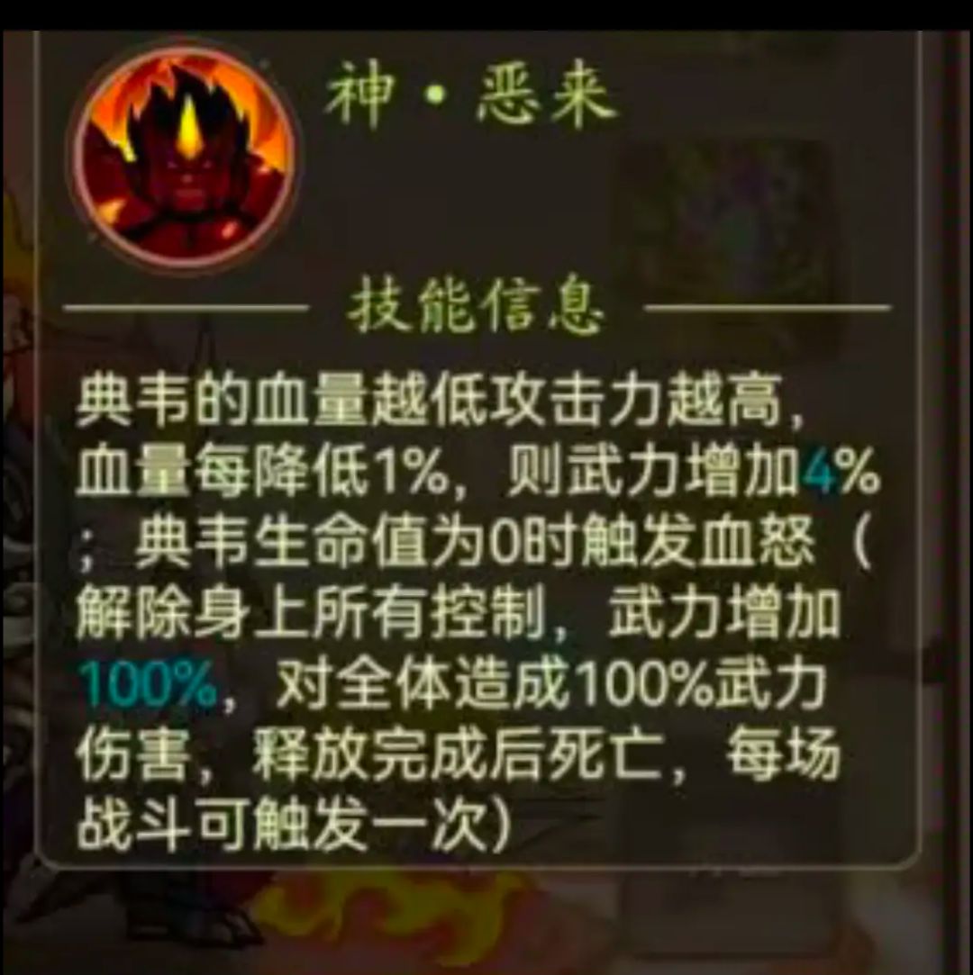 用典韦的主要是有三倍武力加成,十觉50增伤,但压血限制非常大,容易死,而且单体定位不行,现在的辅助大多数都有回血功能,适合他的武将不多。