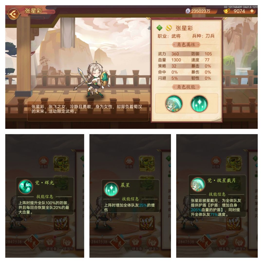 平民安全感最强的武将,觉醒后的星彩很好用,普攻能够进行清策,在高强度伤害副本的时候,上星彩可以大大提升队伍的生存能力,建议先搞五觉,然后专属再到资质最快15周就可以上场了,你们列传获取的武将就关银屏和张星彩,所以只能培养他。