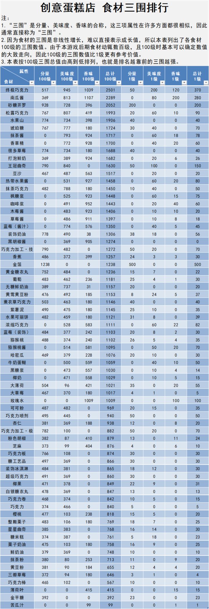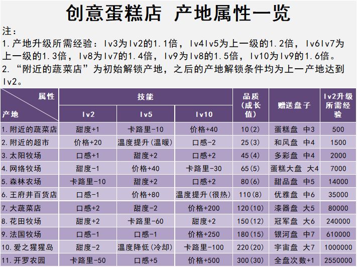 配图为场地加成、食材三维排行、蛋糕配方参考。