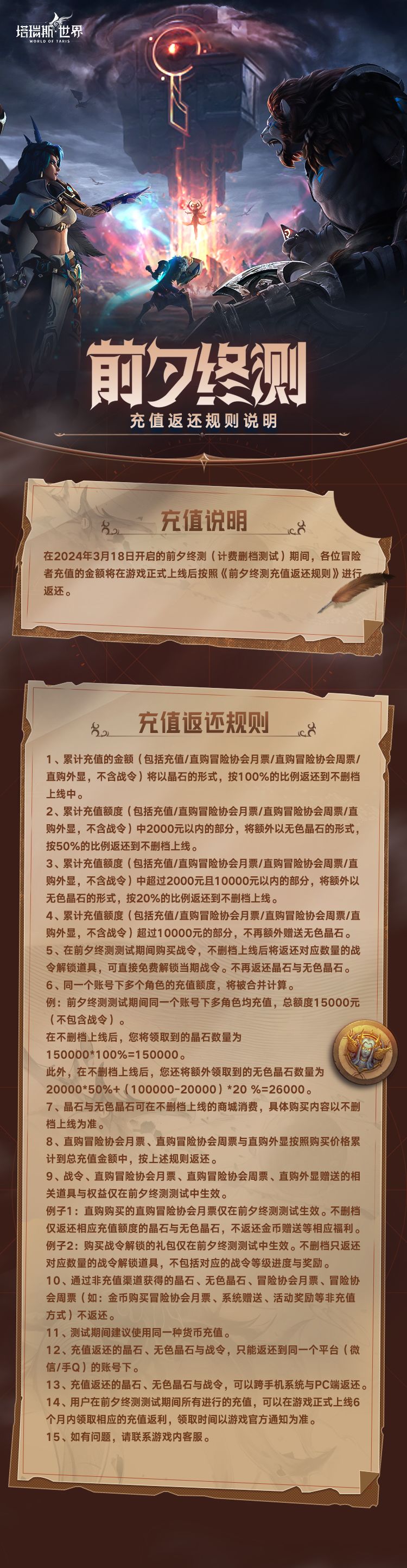 各位冒险者,以下是《塔瑞斯世界》前夕终测充值返还规则说明。