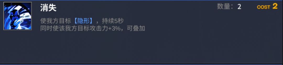 【消失】:叠伤能力优秀,在高速过牌,卡牌循环快速的情况下,能够给到菲妮娅非常高的攻击力加成,同时过一牌优先红牌的属性,也使得这张卡等于没有亏手牌,同时协同卡罗琳的红卡,来做到过牌和循环