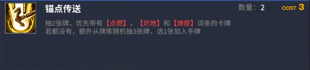 【锚点传送】:3费过3-4牌的含金量,加上共振5的存在,变为3费4-5牌,这已经是非常夸张了,且过的牌不会影响到你后续的循环,因为她优先抽取火属性卡,这就使得我们可以随意丢弃掉这些抽取的牌,而不会出现没费出不起强卡而被迫丢弃影响循环的问题。