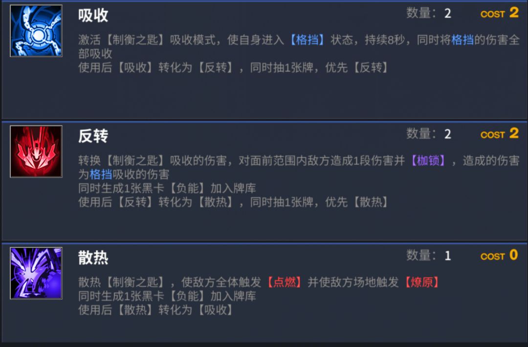 【吸收】【反转】【散热】:这一套整体组合可以算作是4费自抽卡2张,生成一张黑卡,整体来说是亏费的,有点在于坦度高,但是在极高爆发的情况下,卡组回转需求下,大部分情况都不会长时间开着吸收,所以实际表现并不会非常好