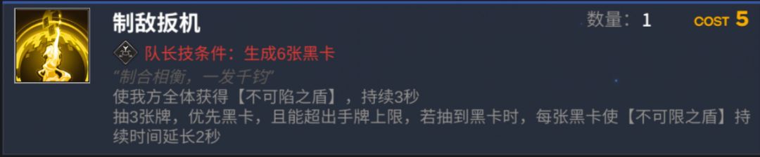 【制敌扳机】:无敌3秒,过3牌,无敌的含金量大家也都懂,虽然还有一个回费,但是体系中只有她自己可以产出黑卡,所以效率及其底下,不过无敌加过牌已经可以给到她一席之地,回费只是添头
