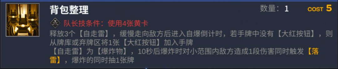 【背包整理】:直接召唤3个自走雷,可以理解为抽1卡,然后延时抽3卡,在后期弃牌雷大成的情况下,无限磁化使得费用不在紧缺,属于出必甩的卡