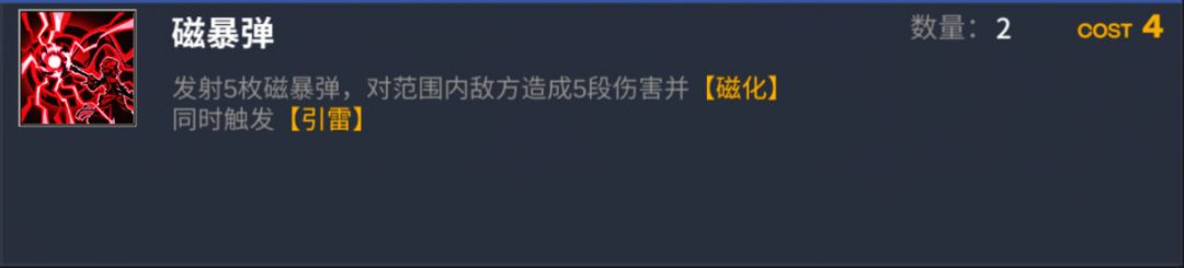 ,确实有点逆天,但是卡洛琳也是必须要有的,顶级的雷队辅助,团队的主要回费手段之一。【磁暴弹】:没啥好解释的,自己看图吧,逆天的磁化以及过牌,虽然本身费用很贵,但是后期启动后是基本不缺费用的。