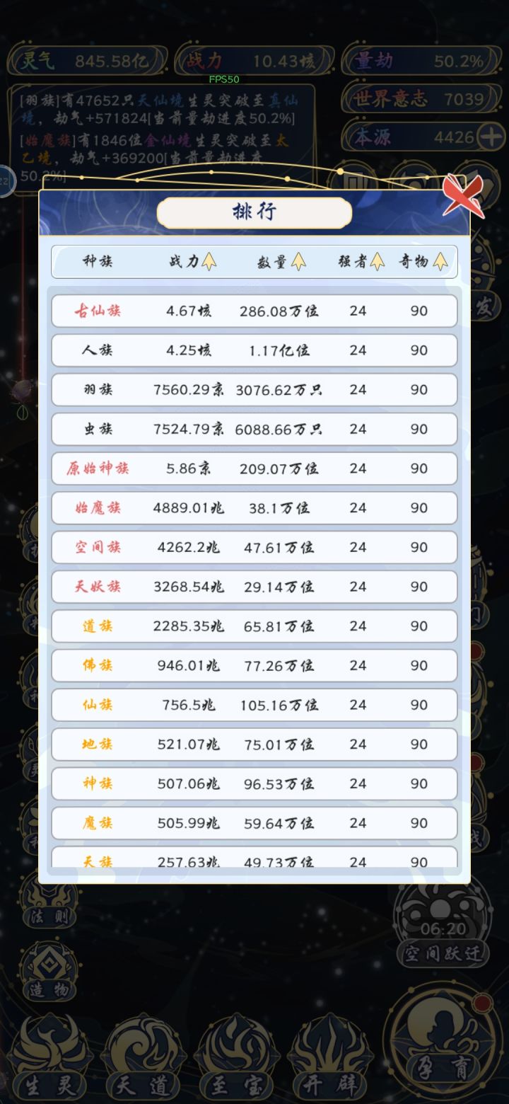 优先提升战力,世界升满灭种族剩人族和2红色。然后开刷人族人口,主人族开搞,人族气运满16层,最终比其他种族气运搞满都强
