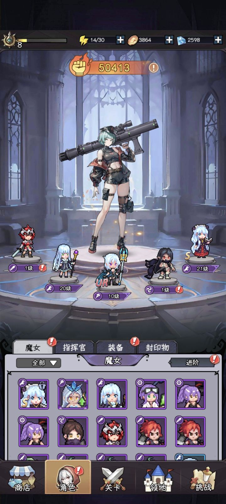 3、前期尽量使用恶魔猎手群系的角色(影魔猎手,瘟疫猎手)。除此之外,如果用送的🔑和契约石没抽到S魔女(猎魔,隐月,冰法或者大将军均可)和UR魔女(修女,雷法,刺客),可以考虑重新开局,不过现在累计68有自选s了,优先选择s猎魔>冰法>隐月(最好魔王开那天选,有s猎魔魔王成绩会有极大提升),如果都有了留着哪个缺一升红换谁。(每天0点和12点都会开新服)