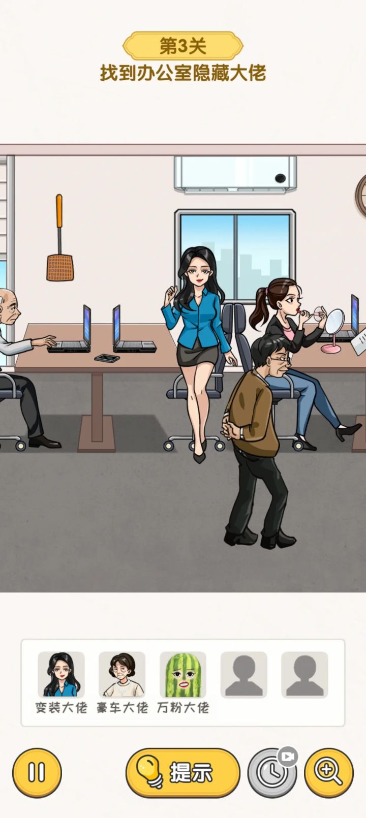 无敌脑洞王者关卡主体是找东西,目的是找出一些和场景不和谐的或者是要求你找出的东西,在这里面你可能会遇到的是不符合画面的和不符合常理的事物,或者是谐音梗,仔细找找基本都能找到,如果没找到的话就多在画面上点点,点是不会减少时间这一点非常好